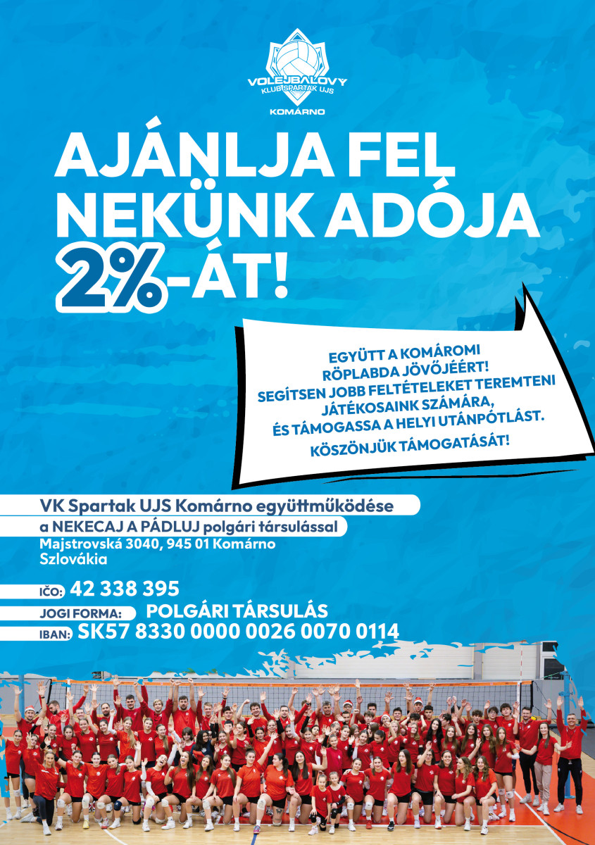 Klubunk, mint civil szervezet, partnerségi együttműködésben áll a „Nekecaj a pádluj” nevű civil szervezettel, amely a Szlovák Köztársaság Közjegyzői Kamarájának központi nyilvántartásában szerepel, és jogosult a befizetett adó 2%-ának fogadására. Ezúton tisztelettel kérjük Önöket, hogy amennyiben még nem döntöttek másként, ajánlják fel jövedelemadójuk 2%-át klubunk támogatására. A felajánlott összeget a lehető legjobb célra fordítjuk.